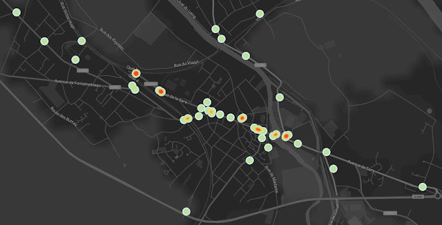 Les points noirs font également ressortir l’axe J. Jaurès – rue Grande -rue Sisley mais également des intersections : entrées/sorties de la piste de la rue de la Gare, le giratoire à la sortie du pont de Moret, la sortie de la piste de l’av. de Fontainebleau au niveau du pont.